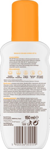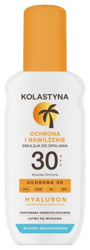Emulsja do opalania w sprayu SPF 30 KOLASTYNA oferuje skuteczną i fotostabilną ochronę przed 4 głównymi rodzajami promieniowania (UVA, UVB, światło widzialne, promieniowanie podczerwone), które przyczyniają się do poparzenia słonecznego oraz powstawania wolnych rodników odpowiedzialnych za przedwczesne starzenie oraz fotostarzenie skóry.