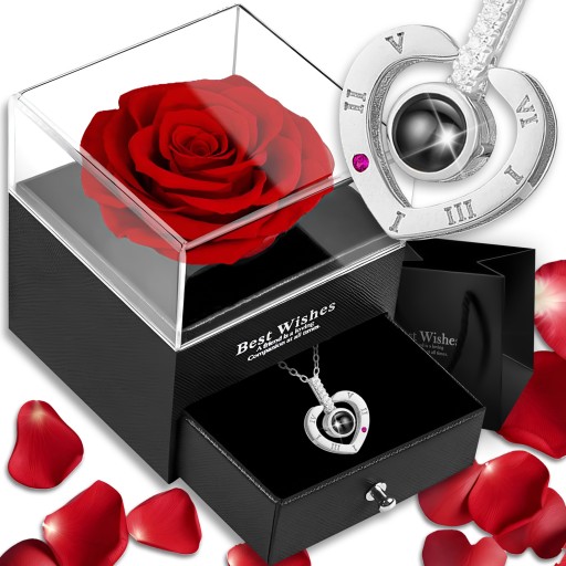 Wieczna róża zapakowana w elegancką szkatułkę z przeźroczystą górą przez którą widać róże oraz szufladką, w której znajduje się naszyjnik w kształcie serca i napisem wyznającym miłość - zrobi ogromne wrażenie!