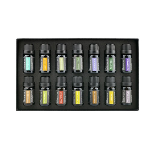 Zestaw 14 sztuk: bergamotka, eukaliptus, grejpfrut, trawa cytrynowa, rozmaryn, słodka pomarańcza, lawenda, ylang-ylang, drzewo herbaciane, cytryna, paczula, kadzidło