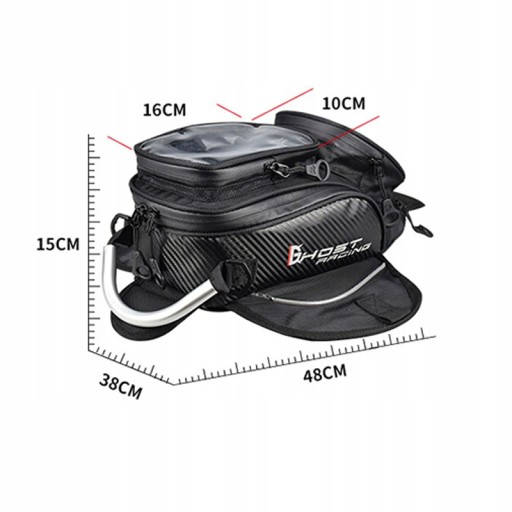 Prosta i stylowa torba na bak o dużej pojemności,Jest zabezpieczony magnesami i paskami,Świetne do motocykli z metalowymi zbiornikami paliwa,W zestawie wodoodporny osłona, który chroni przedmioty przed zamoczeniem podczas jazdy w deszczu