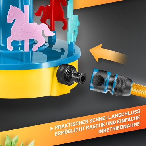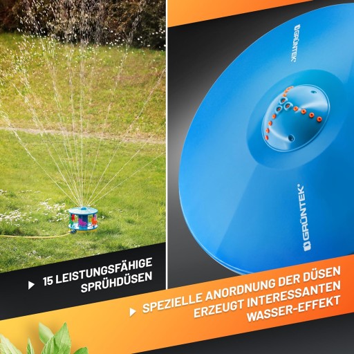 - Idealny na lato: nasz zraszacz karuzelowy zapewnia nie tylko efektywne nawadnianie trawnika, ale dzięki kolorowej, przyjaznej konstrukcji i ruchomym elementom zachęca również do chłodzenia w gorące dni