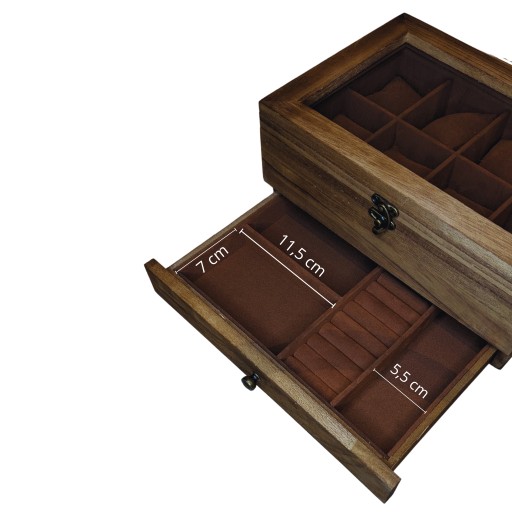 Rustykalna Drewniana Rama: Dodaje subtelności i sprawia, że szkatułka doskonale komponuje się z Twoją biżuterią, nie odbijając jej blasku.