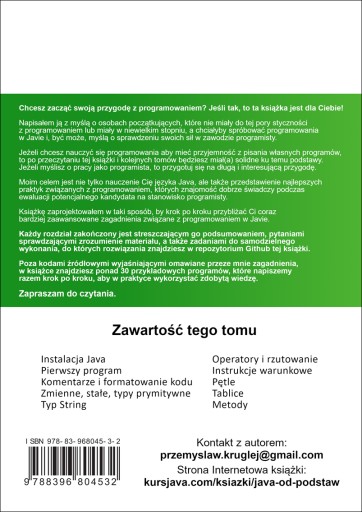 Wraz z moimi dodatkowymi kursami „Podstawy linii poleceń” oraz „IntelliJ IDEA w akcji”, które dostępne są za darmo na mojej stronie, „Java od podstaw” będzie Twoim pierwszym krokiem na drodze do stania się programistą Java. Pierwszy tom zawiera następujące rozdziały: