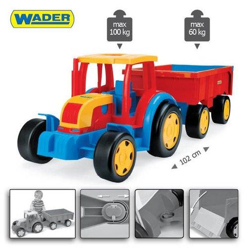 Duży traktor z przyczepą o ogromnej wytrzymałości i dużych gabarytach (długość około 102.0 cm) posiada wiele ruchomych elementów i zapewnia wyśmienitą zabawę.
