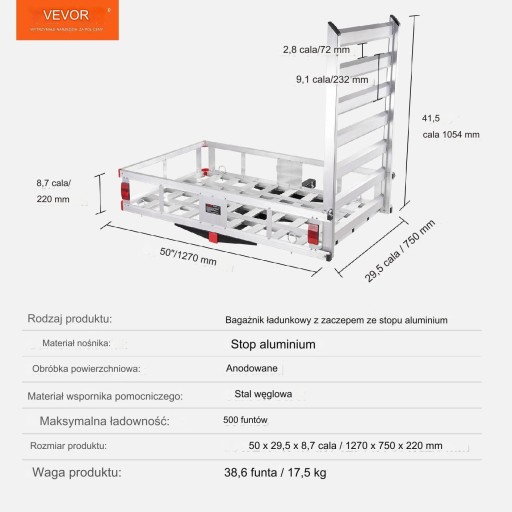 Wyposażony w przedłużoną rampę o długości 105 cm, bagażnik ten oferuje łatwość składania i rozkładania za pomocą praktycznego zatrzasku. Jest to niezwykle wygodne podczas transportowania ciężkich maszyn, takich jak wózki inwalidzkie, hulajnogi, kosiarki do trawy czy odśnieżarki.