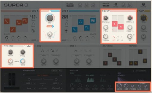 Super 8 posiada modulację częstotliwości wprowadzoną przez regulację pokrętła FM (główne pokrętło pośrodku). Oznacza to, że wyjście oscylatora 2 działa jako źródło modulujące częstotliwość oscylatora 1 – przydatne w przypadku bardziej metalicznej ostrości.