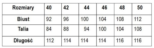 Poniżej zamieszczamy Tabelę rozmiarów dla tego produktu. Na prośbę Klienta możemy zmierzyć każdą sukienkę. Jeśli Twoje wymiary różnią się od tych w tabeli rozmiarów lub nie są jednoznaczne (wahasz się pomiędzy dwoma rozmiarami), rekomendujemy zakup większego rozmiaru.