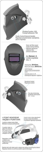 Przyłbica spawalnicza z filtrem samościemniającym. Klasa optyczna 1/2/1/3. Wysokiej jakości filtr wyposażony w 4 sensory łuku zapewnia pole widzenia 98*43 mm, stan ciemny DIN 9-13, stan jasny DIN4, czas reakcji 1/25000 s., czas rozjaśniania 0,1-1,0 s., a czas zaciemniania 0,3-0,8 ms. Ponadto filtr zapewnia ochronę przeciw promieniom UV/IR na poziomie DIN16. Przyłbica posiada płynną regulację czułości oraz przyciemnienia, a także stopniową regulację szybkości ściemnienia. Zasilana jest ogniwem słonecznym, a także 2 bateriami 3 V typu CR2450 i ma funkcję automatycznego włączania/wyłączania. Przyłbica ma dodatkowo funkcję ochrony podczas szlifowania. Może być używana w zakresie temperatur od -5 st. C do +55 st. C. Poza tym wyposażona jest w bardzo wygodną 4-punktową więźbę z 2-punktową regulacją wysokości, regulacją pozycji potylicznej, płynną regulacją obwodu z systemem grzechotkowym, a także odległości od filtra.