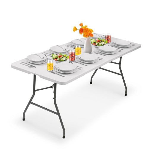Biały stół składany Tadar 180 x 74 x 74 cm jest duży i stabilny. Jego blat wykonano z twardego tworzywa sztucznego, co ułatwia pielęgnację. Składane pod blat nogi są stalowe i mają zabezpieczenie przed złożeniem pod ciężarem jedzenia i napojów. Gdy go nie używasz lub chcesz przewieźć, zamieni się w stół-walizkę. W tej sprytnej konstrukcji nogi modelu ukryte są wewnątrz. Uchwyt pomoże natomiast w komfortowym przenoszeniu. Mając go, zadbasz, by na bankiecie było osobne miejsce na wszystkie przekąski. Rozstawisz go też, robiąc przyjęcie z cateringiem na świeżym powietrzu. Przede wszystkim jednak zyskasz stół składany w walizkę, który łatwo przechować i przewieźć. Zabierzesz go również na kemping lub użyjesz w czasie domowych imprez (np. świąt w większym gronie). cateringiem. Nawet podczas grillowania to świetna opcja na organizację przestrzeni oraz przygotowanego jedzenia.
