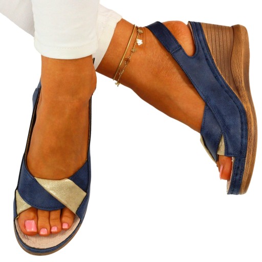 HIT sandały eleganckie damskie na koturnie w kolorze granatowo złotym, lekkie i wygodne.