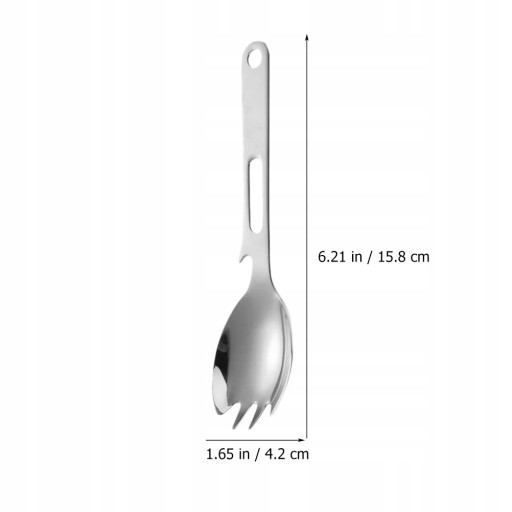 Ten produkt to wielofunkcyjny spork, wykonany ze stali nierdzewnej, odporny na rdzę, lekki i kompaktowy. Nadaje się na kemping, piknik, na zewnątrz, rodzinę, restaurację itp. Ta łyżka kempingowa może być używana zarówno jako otwieracz do butelek, jak i sztućce. Zapewnij więcej wygody dla swojego życia.
