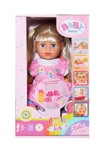 BABY born Kindergarten Little Sister 36cm z sukienką, legginsami i butami. Zawiera butelkę, szczotkę, 4 spinki do włosów, 2 spiralne spinki do włosów i 1 bransoletkę przyjaźni dla dziecka i lalki.