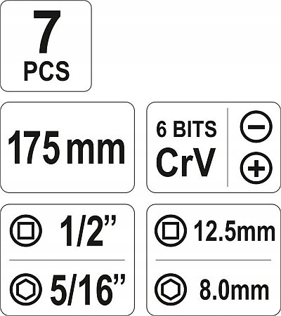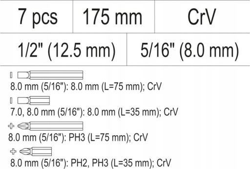 Wkrętak udarowy z plastikową rękojeścią o długości 175mm z 6 czernionymi końcówkami. Krzyżakowe: PH2, PH3; płaskie: 7, 8mm- długość 35mm, oraz bity płaskie: 8mm: krzyżakowe PH3-długość 75mm. Wykonane ze stali chromowo-wanadowej CrV.