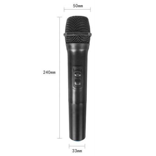 Mikrofon bezprzewodowy VHF z odbiornikiem 50m stabilna odległość transmisji, stabilny sygnał, brak opóźnień, brak zakłóceń Wysokiej jakości transmisja dźwięku, czysty głos i bez szumów, bez zniekształceń Idealny wybór na imprezy karaoke, DJ, wesela, kościół, spotkania biznesowe, zajęcia w klasie, występy plenerowe lub sceniczne Odbiornik zasilany jest baterią 18950 800 mAH li wielokrotnego ładowania Mikrofon ręczny jest zasilany bateriami AA (brak w zestawie) Rozmiar: około 24x5cm / 945x197 cala