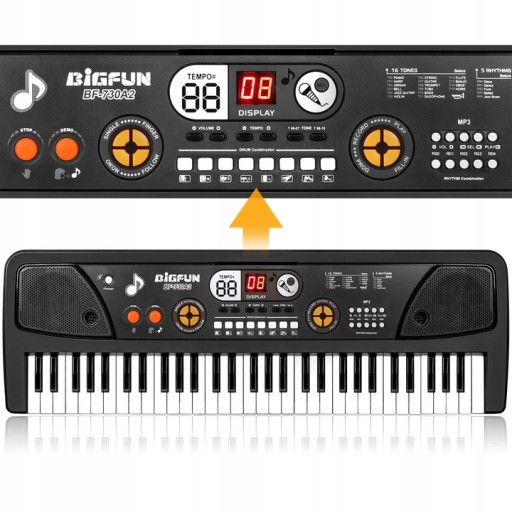 Keyboard 61 Klawiszy + funkcja ładowania, ładowanie USB + podwójny głośnik + nagrywanie / programowanie / wkładanie + głośność / prędkość rytmu + wyświetlacz + mikrofon + stojak muzyczny + 5 rytmów muzycznych + 6 utworów demonstracyjnych + 16 rodzajów dźwięków, 8 instrumentów perkusyjnych ,funkcja MP3