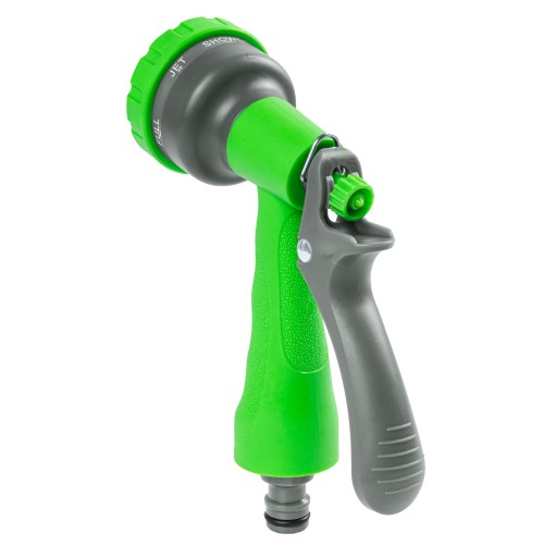 Dzięki temu, że pistolet posiada siedem funkcji zraszania: ciągły strumień, mgiełka, kilka strumieni ze środka, delikatne strumienie, prysznic, płaski strumień czy rozproszony strumień, z łatwością dostosujesz odpowiedni tryb do aktualnych potrzeb. Idealnie sprawdzi się do delikatnego podlewania roślin jak i umycia samochodu, kostki na podjeździe, elewacji domu czy wykąpania psa. Wystarczy tylko ustawić wybraną funkcję za pomocą antypoślizgowego pokrętła.