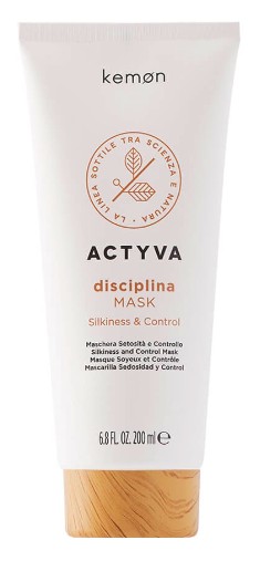 Kemon Actyva Disciplina Maska pomaga wygładzić włosy kręcone, nadaje im jedwabisty połysk i ułatwia ich układanie dyscyplinując włosy. Zapobiega puszeniu i ułatwia rozczesywanie włosów. Zawarty w składzie olejek migdałowy odżywia włosy i pomaga zdyscyplinować niesforne kosmyki, natomiast olejek brzoskwiniowy regeneruje strukturę włosa.