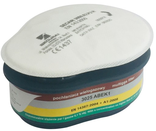 - Pochłaniacze wielogazowe SECURA 3025 ABEK1, po skompletowaniu z półmaską lub maską, chronią układ oddechowy przed gazami organicznymi i nieorganicznymi, parami i gazami substancji organicznych, parami i gazami kwaśnymi, amoniakiem i jego pochodnymi organicznymi a także mieszaninami w/w substancji