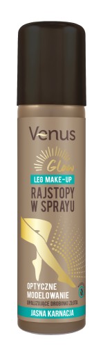 Venus wodoodporne rajstopy w sprayu do jasnej karnacji. Fluid o lekkiej konsystencji pozwala osiągnąć efekt pięknej i naturalnej opalenizny bez smug. Innowacyjna formuła kosmetyku maskuje wszelkie niedoskonałości, przebarwienia, pajączki i siniaki. Dodatek opalizujących drobinek rozświetla i optycznie modeluje nogi. Rajstopy bezpośrednio po nałożeniu, nadają skórze równomierny odcień. Wygodna i szybka aplikacja sprawi, że z łatwością zadbasz o swoje nogi.