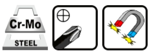 Część robocza wkrętaka została wykonana ze stali chromowo-molibdenowej (Cr-Mo), dzięki temu są wytrzymalsze przy niższej masie własnej, zaś dodatek molibdenu zapobiega deformacjom oraz podwyższa ogólną odporność stali na korozję w środowisku wilgotnym i kwaśnym.