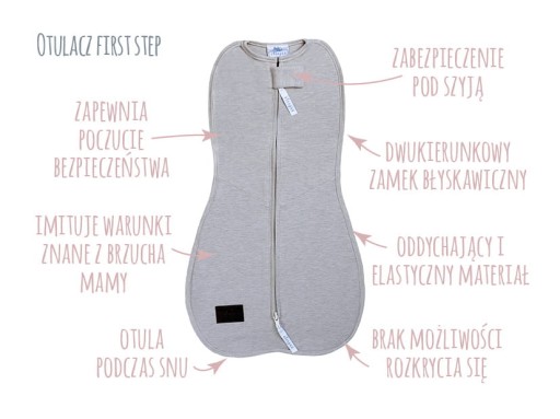 Waga Twojego dziecka - to parametr, którym powinnaś się kierować wybierając otulacz dla malucha. Otulacz First Step pasuje dla dzieci w przedziale 3- 6,5 kg. Nie sugeruj się wiekiem czy długością dziecka - są one zaprojektowane tak aby spełniały swoje zadanie. Stanie się to tylko wtedy gdy otulacz będzie odpowiednio dobrany.