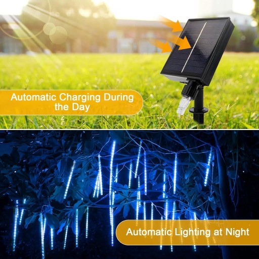 Lampy solarne z deszczem meteorów: te lampy z deszczem meteorów mają dziesięć rurek, każda rura ma 30 cm, każda rura ma 24 diody LED, łącznie 240 diod LED. Super jasne chipy LED zapewniają kąt świecenia 360 stopni. Te dekoracyjne światła przypomiją deszcz, deszcz meteorów, opady śniegu i gwiazdy nocnym niebie.