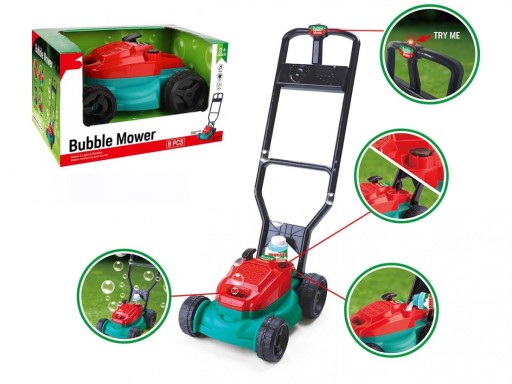 Kosiarka z bańkami mydlanymi pozwala dziecku bawić się w koszenie trawy,