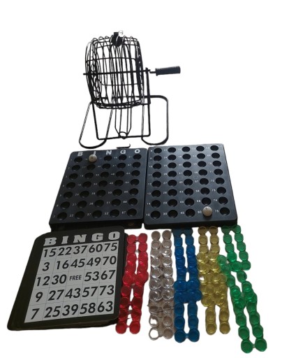 - Dołączone części składowe: Bęben bingo z automatycznym obrotem i tablicą przeglądową Bingo, ponumerowane kule do bingo, 18 kart do bingo, 150 plastikowych znaczków do gry