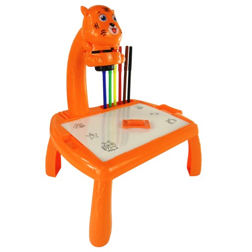Projektor Led rysunek artystyczny stół zabawki dzieci tabliczka do rysowania malowania biurko pisanie rzemiosło nauczanie edukacyjne narzędzia zabawka dla chłopca pomarańczowy tygrysProjektor do nauki rysowania i malowania to świetny sposób na naukę poprzez zabawę dla Twojego dziecka. Już od najmłodszych lat pobudza wyobraźnie, ćwiczy spostrzegawczość oraz pamięć. Edukacyjna zabawka, która rozwinie w dziecku zdolności plastyczne, które zaowocują w dalszej nauce w przedszkolu, a później w szkole. Rzutnik w ładnym kolorze pomarańczowym to idealny prezent dla każdego dziecka, która lubi rysować. Buźka tygryska dodatkowo zwróci uwagę dziecka, a miły akcent będzie wzbudzał pozytywne skojarzenia z malowaniem!Dziecko będzie zainteresowane i chętne do zabawy przez długie godziny, a dołączone do zestawu 3 wymienne krążki z rysunkami, pozwolą mu na wykonywanie pięknych rysunków!Cechy produktu:✅ Projektor posiada 3 krążki z tematycznymi wzorami, dzięki którym dziecko uczy się nazw podstawowych zwierzątek, pojazdów oraz owoców.✅ Żywa kolorystyka projektora w odcieniach pomarańczowego przykuwa uwagę dziecka zachęca do zabawy.✅Buzia Tygryska dodatkowo wzbudzi zainteresowanie i zachęci do zabawy.✅ Łącznie posiada aż 24 wzory do rysowania, które zapewniają długie godziny świetnej zabawy dzięki czemu rodzic może liczyć na chwilę dla siebie.✅ Projektor również może pełnić funkcję lampki nocnej, przy której dziecko może spokojnie zasnąć.✅ Projektor do rysowania można zabrać ze sobą na ogródek czy do restauracji dzięki czemu Twoje dziecko w każdym miejscu dobrze będzie się bawić.✅ Zabawka zapakowana w ładne kolorowe pudełko z rączką, dlatego idealnie sprawi się na prezent.✅ Z projektora można usunąć dwie przednie nóżki i traktować projektor jako sztalugę do rysowania.SPECYFIKACJAWiek: +3Kolor: pomarańczowyWymiary rzutnika: 32 x 29 x 22 cmWymienne krążki: tak, 3 tematyczne – zwierzątka, pojazdy i owoce.Krążki: na każdym dysku 8 obrazkówWymiary opakowania: 30 x 23 x 9 cmWymiary miejsca do malowania: 22 x 16 cmŚrednica krążka: 5,5 cmDługość mazaków: 14,5 cmWymiary bloczka do rysowania: 14 x 10,5 cmWymiary gąbeczki do zmazywania: 5,5 x 3,5 cmZasilanie: 3 baterie AA (brak w zestawie)Certyfikaty: CE, EN 71PROJEKTOR RZUTNIK DO NAUKI RYSOWANIATworzenie rysunków przez projektor do rysowania pobudza wyobraźnię Małego artysty, która przelewa swoje artystyczne pomysły na kartę papieru. Dziecko trzymając kredkę lub mazak od najmłodszych lat ćwiczy sprawność dłoni, koordynację ruchową oraz umiejętność postrzegania. Jak wiemy w obecnych czasach dzieci szybko się rozpraszają, a dzięki odrysowywaniu slajdów projektora do nauki rysowania dziecko uczy się koncentracji i skupienia.Rysowanie daje wielu dzieciom spokój przez co mogą odreagować emocje i wyciszyć się dając rodzicom chwilę wytchnienia.Zabawka pomaga miło spędzać czas z całą rodziną, gdyż każdy z członków może spróbować swojego talentu w rysowaniu i odrysowaniu.PROJEKTOR DLA DZIECI DO RYSOWANIAWszystkie dzieci uwielbiają rysować. Ten projektor umożliwia stworzenie pięknych obrazków za pomocą światła! Pobudzenie wyobraźni nie polega tylko na odwzorowaniu slajdu z obrazkiem. Można dorysowywać własne postacie i tła dzięki czemu może powstać przepiękna praca artystyczna. Na samej podstawie do malowania również znajduje się 6 obrazków, które można odrysowywać: motyla, gwiazdy, gąsienicy, ośmiornicy, cukierka oraz kraba.Do projektora do nauki rysowania dołączone są aż 3 wymienne krążki, a na każdym z nich jest po 8 wzorów podzielonych tematycznie – zwierzęta, owoce oraz pojazdy.Łącznie dziecko może nauczyć się rysować aż 24 różne rzeczy lub tworzyć kolaże!Zaczynając od najmłodszych lat dzieci mogą rozwijać swoją pasje, przeistoczyć się w karierę zawodową malarza plastyka czy artysty lub w hobby na całe życie.Sposób użycia:➡️ Na górze projektora znajduje się włącznik on/off. Po przełączeniu raz włącza się światło, natomiast jeśli przełączymy jeszcze raz w górę włączają się wesołe melodie.➡️ Pod główką tygrysa jest miejsce na krążek.➡️ Projektor do rysowania posiada regulowaną główkę (góra-dół), natomiast całe ramie można przesuwać w lewo i prawo.➡️ Po włączeniu projektora zaświeca się światełko, po włożeniu krążka wyświetlają się slajdy. Slajdy można wyświetlać i odrysowywać w notesiku albo bezpośrednio na podstawie.➡️ Bezpośrednio na podstawie również znajdują się obrazki, które można odrysowywać: motyl, gwiazda, gąsienica, ośmiornica, cukierek oraz krab.➡️ Po skończeniu rysunku można go zmazać załączoną w zestawie gąbką.Obrazki na slajdach:Pojazdy: łódź podwodna, balon, samolot, statek kosmiczny, karetka, autobus, lokomotywa, koparkaZwierzęta: pies, mysz, pszczoła, wieloryb, piskle, kaczka, gąsienica, owca,Owoce: banan, śliwka, jabłko, pomarańcza, bakłażan, dynia, cytryna, marchewka,W zestawie:Projektor z głową tygryska z podstawą do rysowania i 4 nóżkami3 krążków ze slajdami. Każdy krążek posiada 8 obrazków, razem daje to aż 24 różnych wzorów!12 kolorowych mazakówBlok do rysowaniaGąbka do zmywania obrazków z tablicyZabawka zapakowana w ładne kolorowe pudełko, idealnie nadaje się na prezent z okazji urodzin, świąt, imienin, dnia dziecka, na każdą okazję , gdy po prostu kochasz swoje dziecko i chcesz mu sprawić radość.