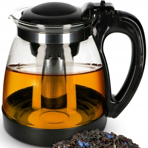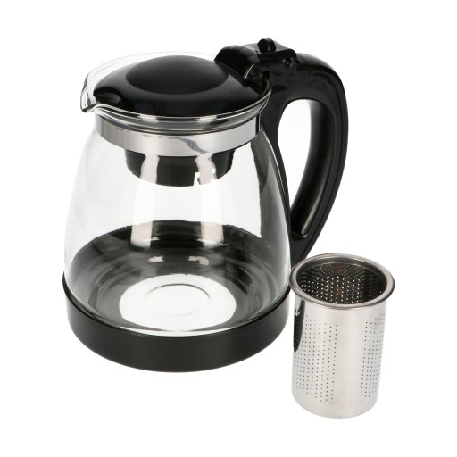 Duży dzbanek do parzenia herbaty z wysokiej jakości szkła z obudową z tworzywa sztucznego i stalowym zaparzaczem.