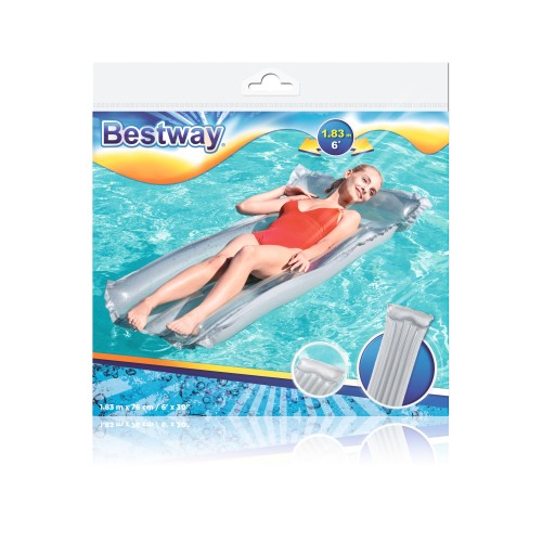 MATERAC DMUCHANY DO PŁYWANIA DELUXE 183x76 cm BESTWAY 44013Materac do pływania firmy Bestway w kolorze pomarańczowym to idealne rozwiązanie na letni wypoczynek nad morzem, jeziorem czy w basenie. Dmuchany materac wykonany jest z wytrzymałego materiału PCV, który posłuży przez klika lat. Charakterystyczną cechą nadmuchiwanego materaca jest zagłówek zapewniający komfort i stałe zanurzenie w orzeźwiającej wodzie. Materac do pływania to wspaniała propozycja dla osób ceniących wygodę i relaks na świeżym powietrzu.Cechy produktu:✅ Dwukomorowa konstrukcja gwarantująca stabilność i wygodę.✅ Wygodny nadmuchiwany zagłówek zapewnia komfort podczas wypoczynku.✅ Wytrzymały materiał wykonany jest z PCV, który jest odporny na wodę morską.✅ Zestaw posiada łatkę naprawczą, która można wykorzystać w przypadku uszkodzenia materaca.✅ Zajmuje mało miejsca, można go wszędzie zabrać na wakacje, basen czy jezioro.✅ Łatwy w nadmuchiwaniu, spuszczaniu powietrza oraz przechowywaniu.✅ Zawór uniemożliwiający przypadkowe spuszczenie powietrza, zapewnia dodatkowe bezpieczeństwo.✅ Zapakowany w ładne i poręczne kolorowe foliowe opakowanie.Specyfikacja:Producent: BestwayWiek:14+W zestawie: Materac plus łatka naprawczaMateriał: PCVKolor: PomarańczowyWymiary: 183 x 76 cmMaksymalne obciążenie: 90kgGrubość materiału: 0,20mmWaga: 0,68 kgWymiary opakowania:29 x 29 x 2 cmNadmuchiwany materac do pływania BestwayNadmuchiwany materac świetnie sprawdzi się na wakacjach nad wodą, zarówno nad morzem czy jeziorem, ale także na basenie. Można skorzystać z niego nawet we własnym ogrodzie w upalne letnie dni. Materac do pływania zapewnia wygodny odpoczynek, a dodatkową stabilność zapewnia dwukomorowa konstrukcja, umożliwiająca równomierne napompowanie. Wykonany jest z wytrzymałego materiału PCV, a w razie uszkodzenia, do zestawu dołączona jest łatka naprawcza. Nienapompowany materac zajmuje mało miejsca, dzięki czemu łatwo zabrać go w każde miejsce.Zapakowany w kolorowe opakowanie idealnie nadaje się na prezent i zajmuje mało miejsca, co pozwala zapakować materac na letni wyjazd.Ostrzeżenie:Do używania jedynie w wodzie, na głębokości, na której dziecko wyczuwa dno pod nogami, oraz pod nadzorem osoby dorosłej.