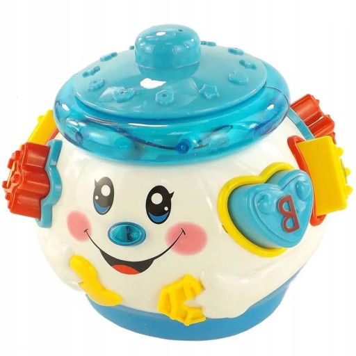 Sorter garnuszek z klocuszkami świeci tańczy dźwięki kształtyInteraktywna zabawka z serii "ucz się i baw", której celem jest nauka poprzez zabawę. Zabawka edukacyjna, która uczy dziecko liczb i rozpoznawania kształtów.Wspaniała zabawka dla dziecka, która stymuluje rozwój oraz wspomaga koordynację wzrokowo-ruchową.Bardzo kolorowy i efektowny garnuszek.Dostępny kolor: żółtyWymiary opakowania: 17 x 16 x 14,5 cmWymiary klocków: ok. 4 x 3 cmWymiary sortera: 17 cm X 15 cmWiek: 3+Zabawka posiada certyfikat Ce, En71.Po włączeniu gra wesołą muzyczkę, jeździ na kółkach i wesoła się kiwa, obręcz świeci, miga kolorowymi światełkami. Po umiejscowieniu klocków w sorterach, znajdują się one w brzuszku garnuszka. Pojemny brzuszek garnuszka zmieści klocki ale i także zapewne inne potrzebne skarby malucha.Funkcje i cechy:edukacyjny garnuszek zawiera otwory o różnych kształtach, stanowiąc tym samym sorter dla klockówkażde prawidłowe umieszczenie klocka w otworze zostaje nagrodzone radosną melodyjkąpodczas zabawy można nauczyć dziecko nazw podstawowych kolorów, kształtów i cyfrW naszym garnuszku znajduje się 6 klocków, które pomagają poznawać kształty przez dopasowywanie ich do odpowiednich otworów w garnuszku. Każdy z klocków jest w innym kształcie i z oznaczeniem cyferki lub literki.Klocki można wyjąć przez otwór pod pokrywką garnuszek ma podświetlany nosek i obrzeże pod pokrywką migającymi diodami porusza się w rytm muzyki kiwając się i obracającWymiary garnuszka -17 cm x 15 cmBaterie: 3xaa ( brak w zestawie)Zabawka posiada certyfikat Ce, En71.Ze względu na małe elementy zabawka nieodpowiednia dla dzieci poniżej 3 roku życia. Istnieje ryzyko udławienia się lub uduszenia.