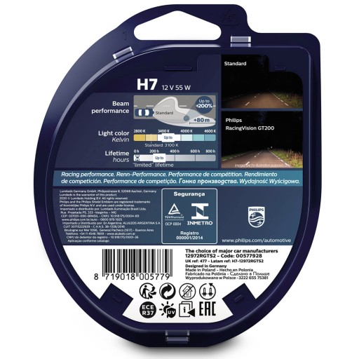 МОЩНЫЕ ЛАМПЫ H7 PHILIPS RACING VISION GT200 +200% НАБОР ИЗ 2 ШТ.