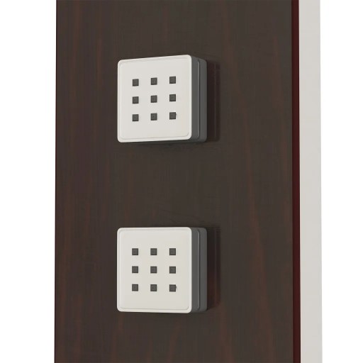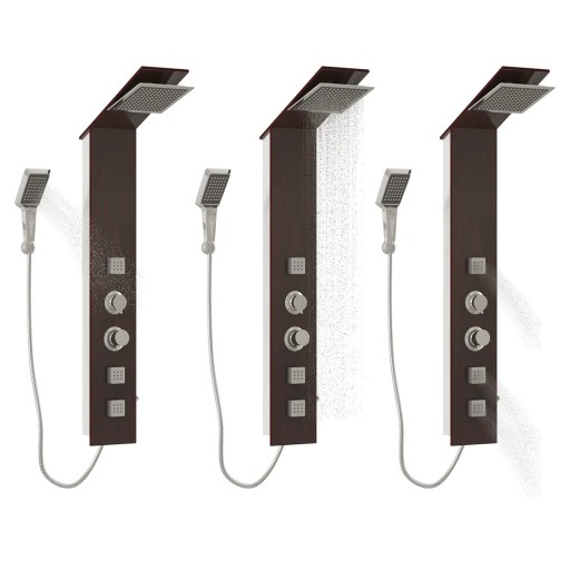 Panel prysznicowy wykonany jest z wysokiej jakości szkła z pięknym nadrukiem na wzór drewna. Ma trzy funkcje: deszczownicę, dysze do masażu i ręczną głowicę natryskową, które można łatwo wybrać za pomocą pokrętła.