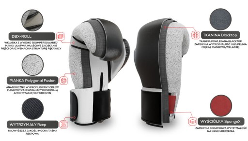 - Rękawice zostały wypełnione specjalną odmianą pianki zapewniającej doskonałą amortyzację uderzeń oraz odporność na zbijanie się.