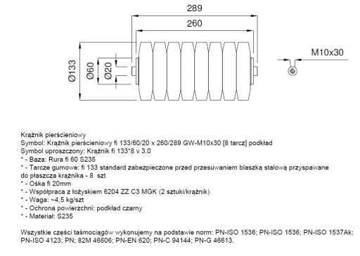 * - Tarcze gumowe: fi 133 standard zabezpieczone przed przesuwaniem blaszką stalową przyspawane do płaszcza krążnika - 8 szt guma trudnościerlana, przeciwpalna atestownana