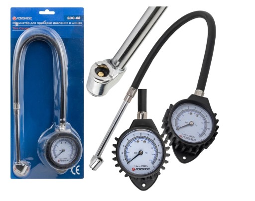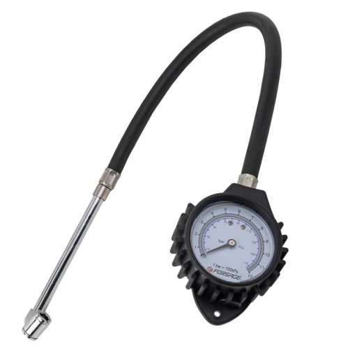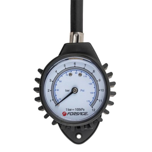 Wskaźnik ciśnienia w oponach posiada zakres pomiarowy od 0 do 12 barów, co pozwala na precyzyjny pomiar ciśnienia w różnych rodzajach opon, od rowerowych po opony samochodowe czy ciężarowe.