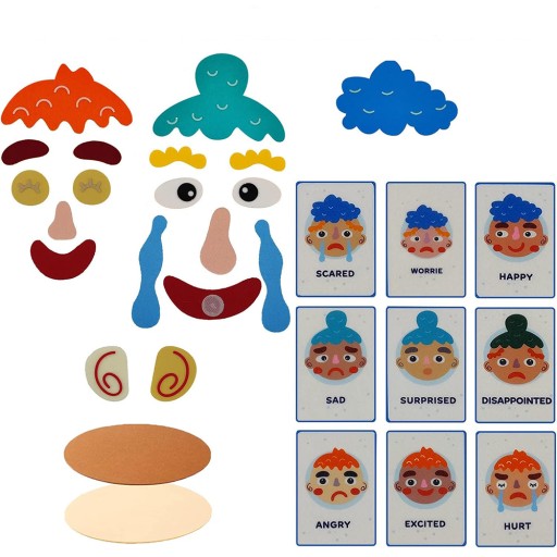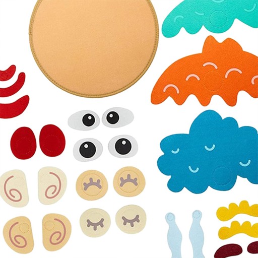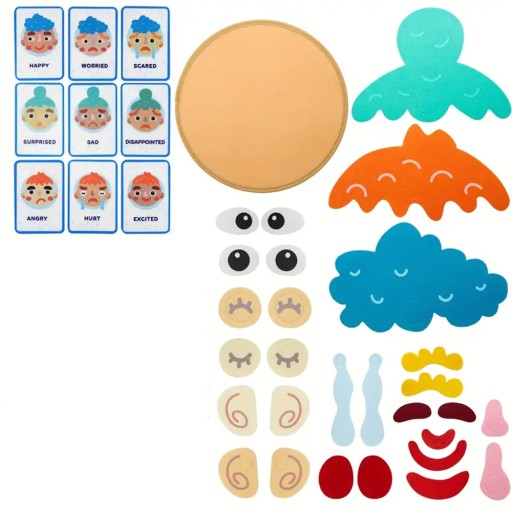 Użyj tych wielofunkcyjnych elementów z miękkiego filcu, aby stworzyć dowolną twarz! Czy to włosy, broda czy brwi? Uśmiech czy grymas? Ta gra społeczno-emocjonalna zawiera dwustronną planszę z dwoma odcieniami skóry, 30 elementów przedstawiających mimikę twarzy do przymocowania, dziewięć fiszek i torbę do przechowywania. Dzięki zabawce dziecko nie tylko tworzy obrazy na podstawie fiszek ale także w łatwy sposób może pokazać co samo czuje i jak rozumie mimikę innych ludzi
