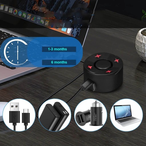 eliminuje kłopoty z wymianą baterii, alarm antykradzieżowy pojazdu może być używany przez 1 do 3 miesięcy (obliczony przez wibrowanie alarmu 5 razy dziennie po uzbrojeniu) na jednym ładowaniu (3 do 5 godzin). Wskaźnik ładowania wyłącza się automatycznie po pełnym naładowaniu. Funkcja przypominania o niskim poziomie naładowania baterii pomaga naładować baterię na czas, aby uniknąć przerw w zasilaniu podczas użytkowania.