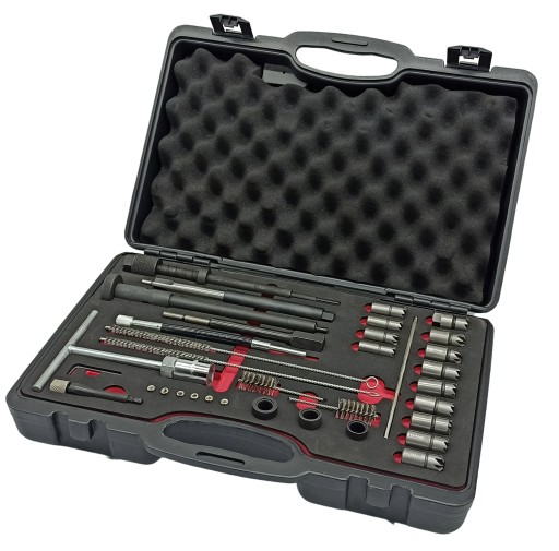 Ten rozbudowany zestaw do czyszczenia gniazd wtryskiwaczy jest niezbędnym narzędziem podczas każdej wymiany wtryskiwacza. Umożliwia dokładne usunięcie nagaru oraz oczyszczenie gniazda, co zapobiega nieprawidłowej pracy silnika, ponownemu gromadzeniu się nagaru oraz zapieczeniu nowych wtryskiwaczy.