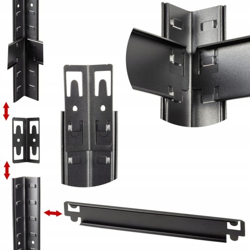 Precyzyjnie spasowane zaczepy wciskane zapewniają łatwy montaż, który może wykonać każdy. Do montażu potrzebujemy tylko gumowego młotka do pełnego zablokowania profili. W zależności od wielkości przedmiotów które będą przechowywane, możemy zaplanować wysokość każdej półki i dopasować do naszych potrzeb. Jeżeli regał jest już złożony a my ponownie chcemy zmienić ułożenie półek to również możemy zmienić położenie poszczególnych półek i szybko dostosować regał do rozmiaru przechowywanych rzeczy.