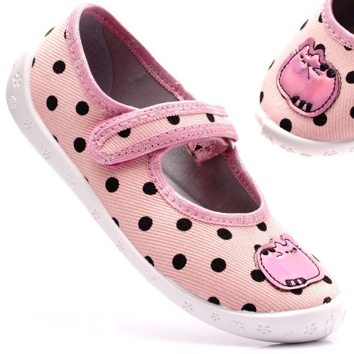 Komfortowe obuwie dziecięce wykonane z bawełnianych tkanin oraz elastycznej podeszwy. Polecane jest jako obuwie na zmianę lub po domu, lecz podczas suchych, ciepłych dni może być użytkowane także na zewnątrz.