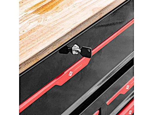 - Dodatkowo każda szuflada posiada indywidualną blokadę, która gwarantuje, że nawet podczas manewrowania wózkiem na pochyłym podłożu, żadna z szuflad nie wysunie się, nawet będąc w pełni obciążona kompletem narzędzi.