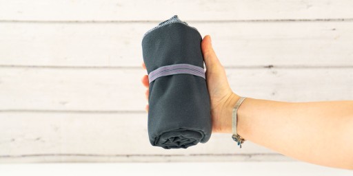 Ręcznik posiada wszytą praktyczną gumkę, która pozwala zarówno na zwinięcie ręcznika w rulon zajmujący bardzo mało miejsca, zwinięcie w "kulkę" mokrego ręcznika, czy na powieszenie ręcznika w dowolnym miejscu.