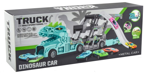 Zestaw składa się z dużej lawety, która posiada składaną 3-piętrową platformę do przewożenia samochodów oraz 3 różnokolorowych autek.