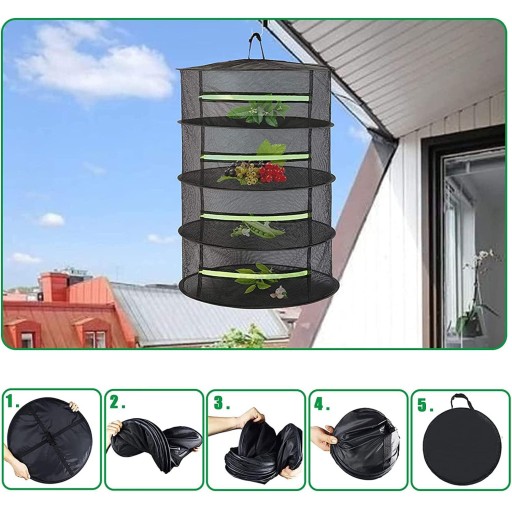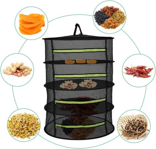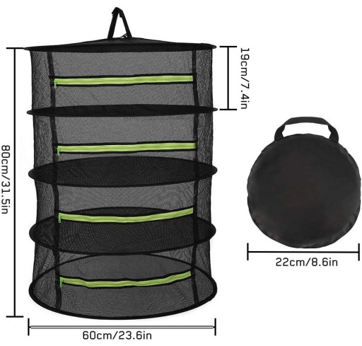 Przyjmuje oddychającą siatkę o wysokiej elastyczności i dużej wytrzymałości na rozciąganie i umożliwia wydajny przepływ powietrza, skuteczną cyrkulację i wentylację. 4-warstwowa konstrukcja, wysokość każdej warstwy wynosi 19 cm. Zajmuje niewiele miejsca i może być swobodnie używany w zależności od ilości suszonych przedmiotów. Każda warstwa jest wyposażona we wbudowany elastyczny stalowy pierścień, który ma doskonałe właściwości przeciwutleniające i odkształcające oraz nie odkształca się ani nie rdzewieje. Składaną konstrukcję można zmontować w kilka sekund i złożyć w celu wygodnego przechowywania. Pozwala to zaoszczędzić miejsce. Zamknięty zamek błyskawiczny ułatwia otwieranie i zamykanie. Konstrukcja zapobiegająca przeciekaniu na bocznych ściankach każdej warstwy, bez obaw o wycieki. Idealny do suszenia różnych rzeczy, takich jak materiały medyczne, żywność, rośliny, płatki, ziarna, przyprawy, fasola, ubrania itp.