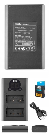 Ładowarka kompatybilna jest z systemowymi akumulatorami FujiFilm, akumulatorami marki Newell oraz innymi zamiennikami.