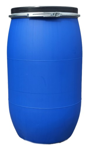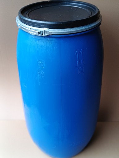 Beczka plastikowa z obejmą metalową o pojemności 150l - nadaje się zarówno do przechowywania, jak i jako pojemnik fermentacyjny (nastawy owocowe, zaciery, cukrówki).