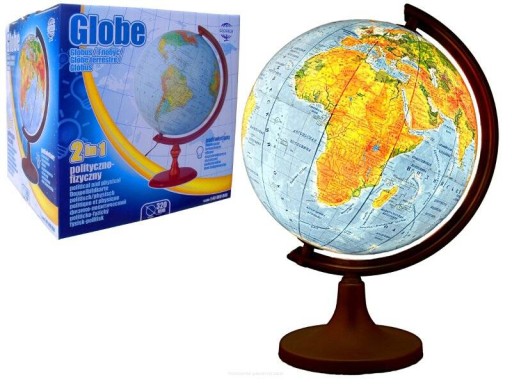 Globus zawierający mapę polityczną Świata. Po podświetleniu pojawia się mapa fizyczna, więc na jednym globusie mamy 2 mapy. Świetnie nadaje się do przyswajania geograficznego położenia nie tylko państw, ale także możemy znaleźć szczyty gór, niziny, wyżyny itp. Globus podświetlany przy pomocy wtyczki do kontaktu.