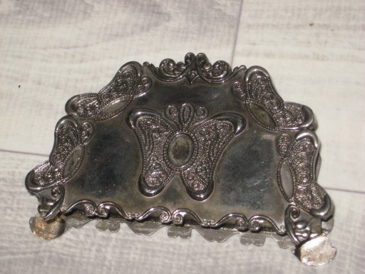 Sprzedam metalowy serwetnik. Posiada ślady użytkowania, w tym rysy i przebarwienia. Jest trochę wygięty, co widać na zdjęciach. Wysokość 7cm, szerokość 2,5cm, długość 12,5cm. \